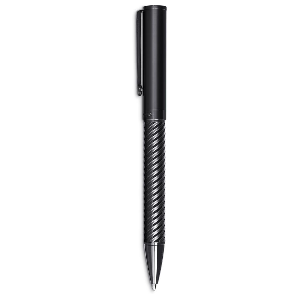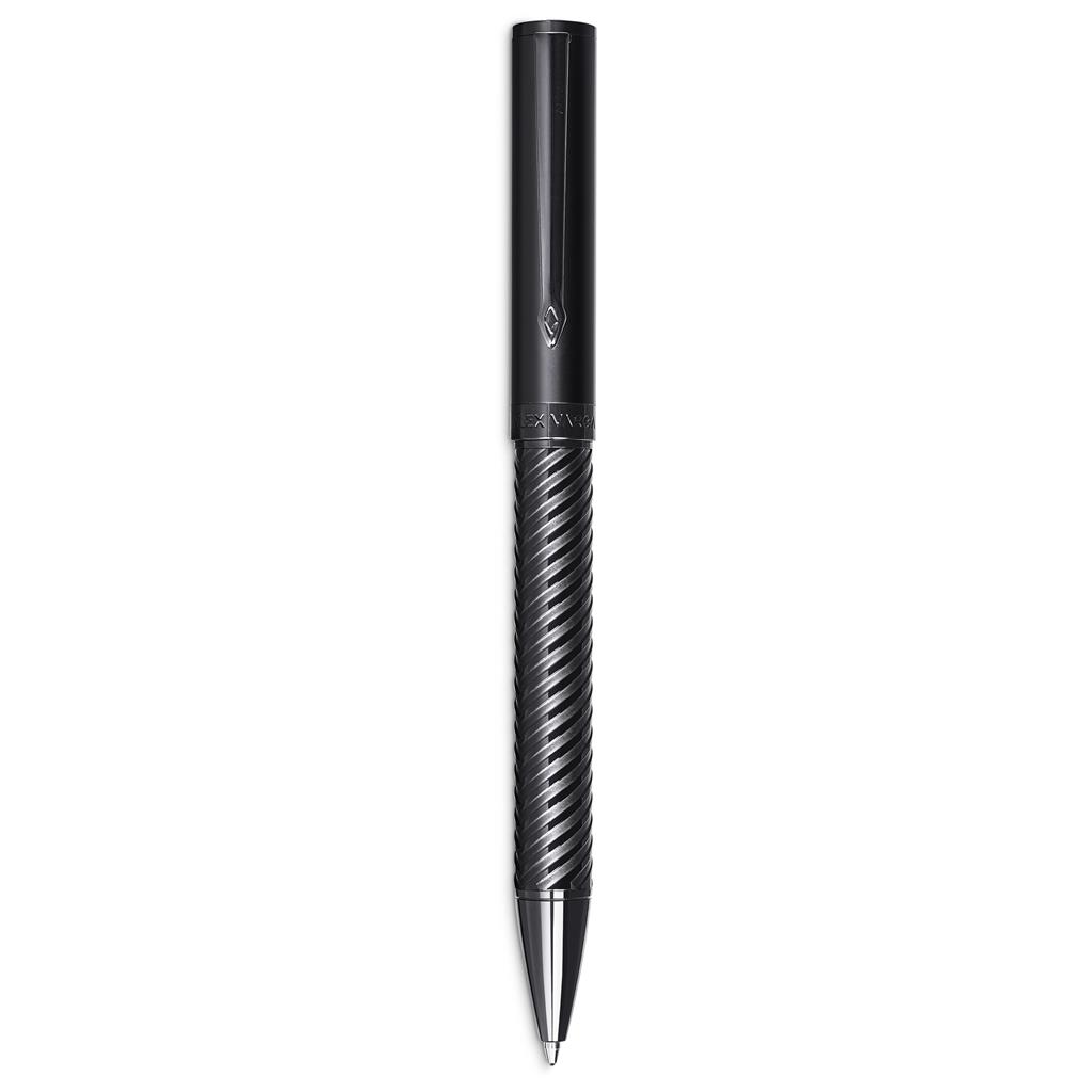 The Alex Varga collection features writing instruments with distinctive yet tasteful designs, and high-quality refills and mechanisms. Each piece or set is presented in elegant packaging, making them gifts which are given with pride and confidence. Both pens in this set combine an embossed patterned lower barrel with a smooth, matte black upper barrel. The ball pen is fitted with a refill which has a minimum writing distance of 3,000 Metres. Replacement refills are available (code AV-19029). View a short clip of the product here