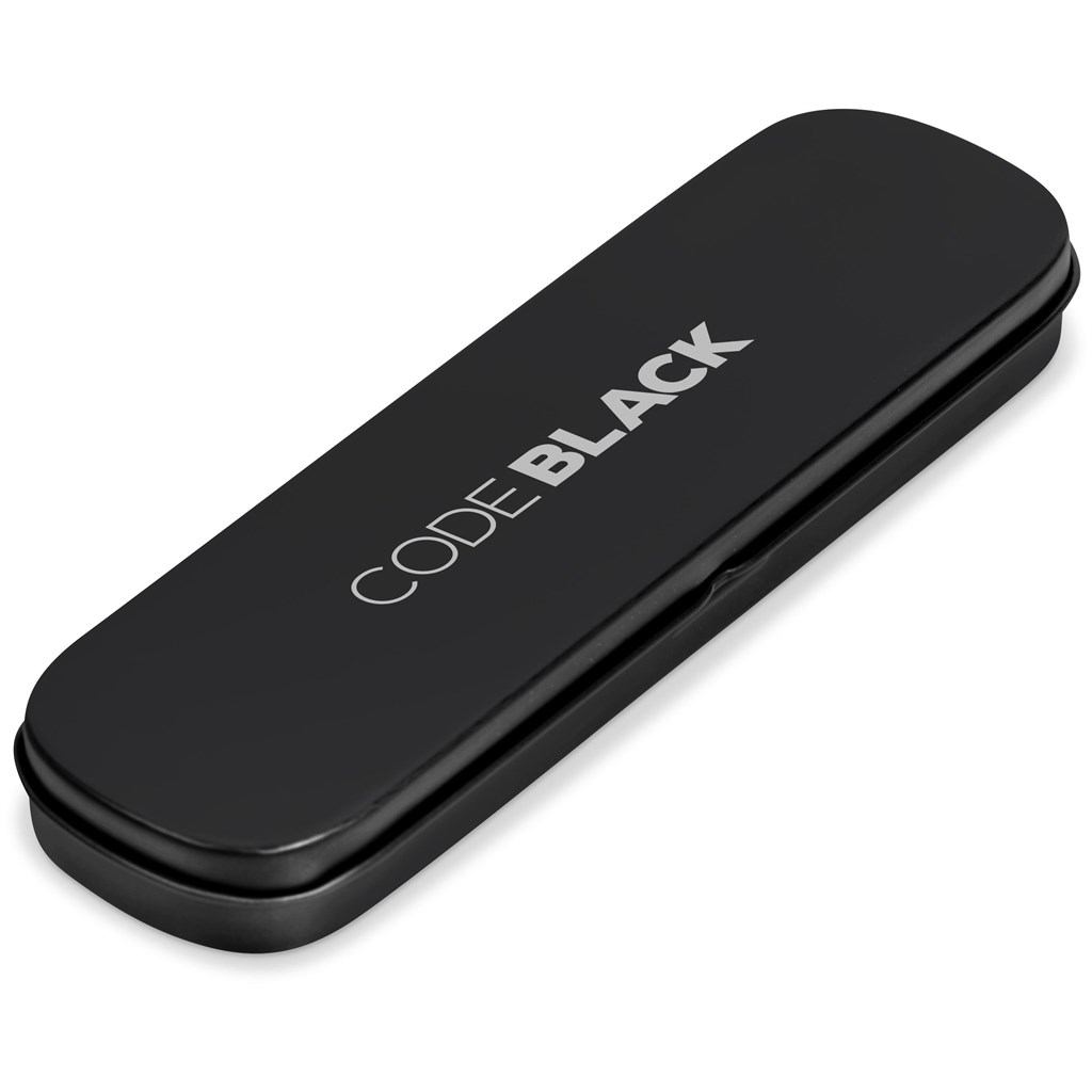 This metal ball pen features a striking carbon fibre look barrel and matte gunmetal trims. It’s packaged in a black tin box and both the pen and the box can be branded with your logo or message.